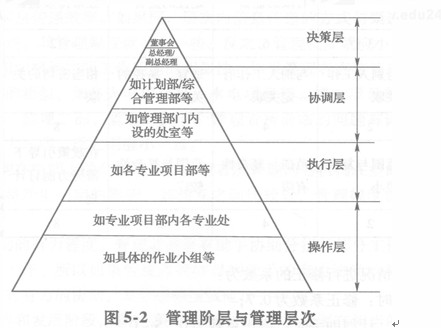 如圖5-2所示。在實(shí)際工作中,有時(shí)協(xié)調(diào)層、執(zhí)行層、操作層之間的區(qū)分不是非常清晰,就某一個(gè)具體部門(mén)而言可能兼顧執(zhí)行層與操作層,有時(shí)又可能兼顧協(xié)調(diào)層和執(zhí)行層。