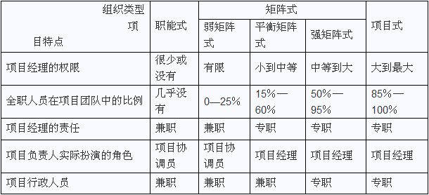 根據項目經理對項目的約束程度,矩陣式項目組織結構又可分成弱矩陣式結構、強矩陣式結構和平衡矩陣式結構三種形式。