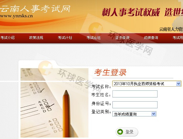 2013年度云南執業藥師資格考試成績查詢開始,環球網校醫學考試網第一時間發布執業藥師考試成績查詢信息。